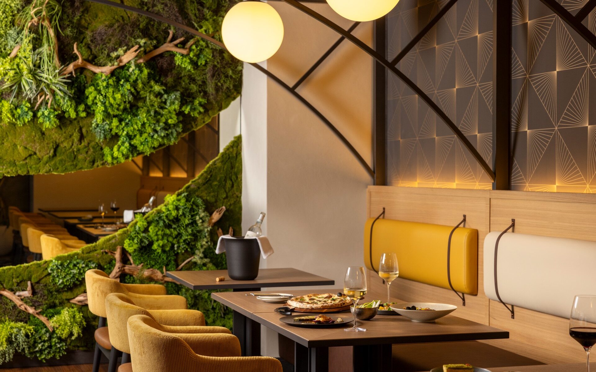 The restaurant features a variety of seats and sofas, catering to your diverse cuisine and daily needs. Take a sit near the floor-to-ceiling green wall dining space, for a more intimate dining nature experience.