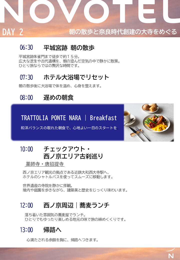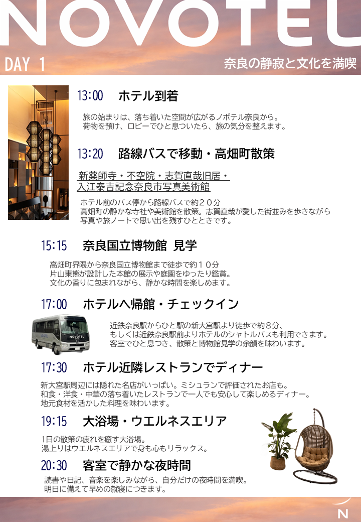 ノボテル奈良を起点に、高畑町や博物館で文化を味わい、朝の散歩や大浴場で心と体を整える、1泊2日のひとり旅モデルステイです。