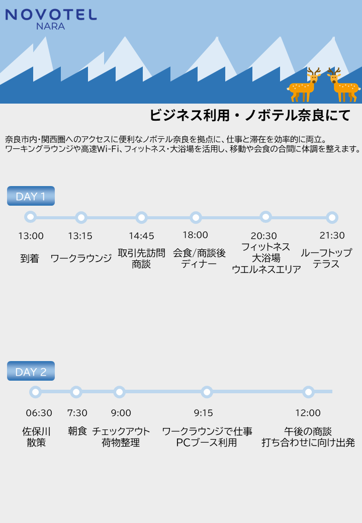 奈良市内・関西圏へのアクセスに便利なノボテル奈良を拠点に、仕事と滞在を効率的に両立。