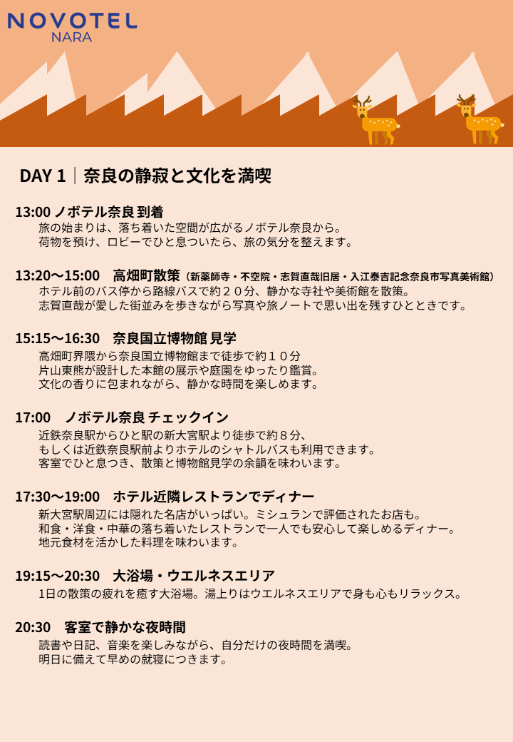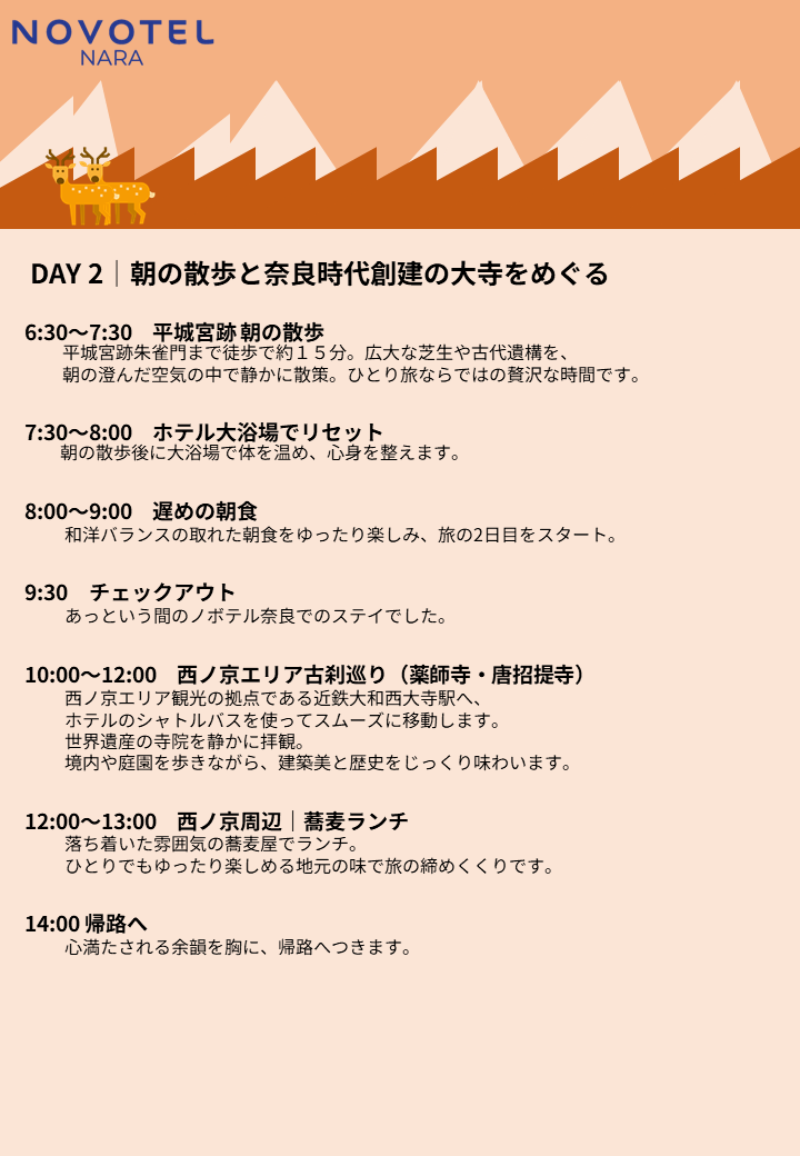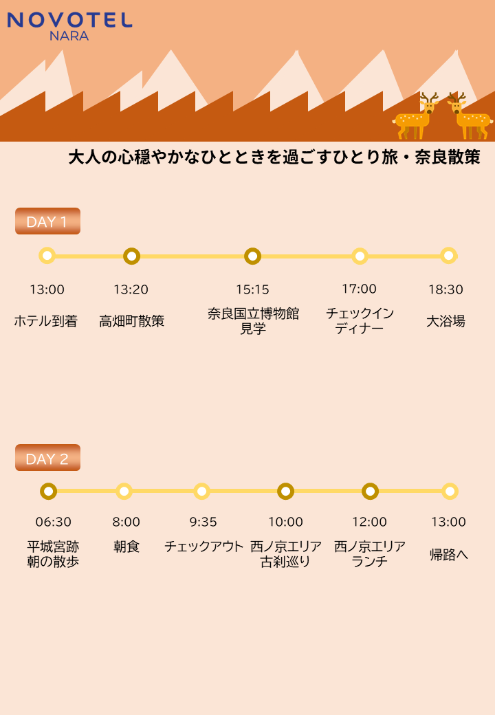 ノボテル奈良を起点に、高畑町や博物館で文化を味わい、朝の散歩や大浴場で心と体を整える、1泊2日のひとり旅モデルステイです。