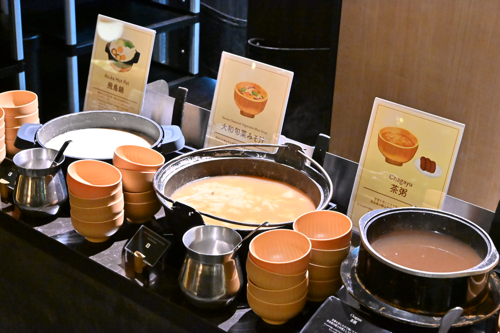 ミルクと味噌を合わせたまろやかなスープが特徴の飛鳥鍋は、古都の知恵が息づく滋味深い一品。 また、豊かな土壌で育った大和野菜を丁寧に煮込んだ奈良旬彩のお味噌汁は、野菜の甘みと香りが広がる優しい味わいです。 体の芯からあたたまる、奈良ならではの朝のごちそうをどうぞ。