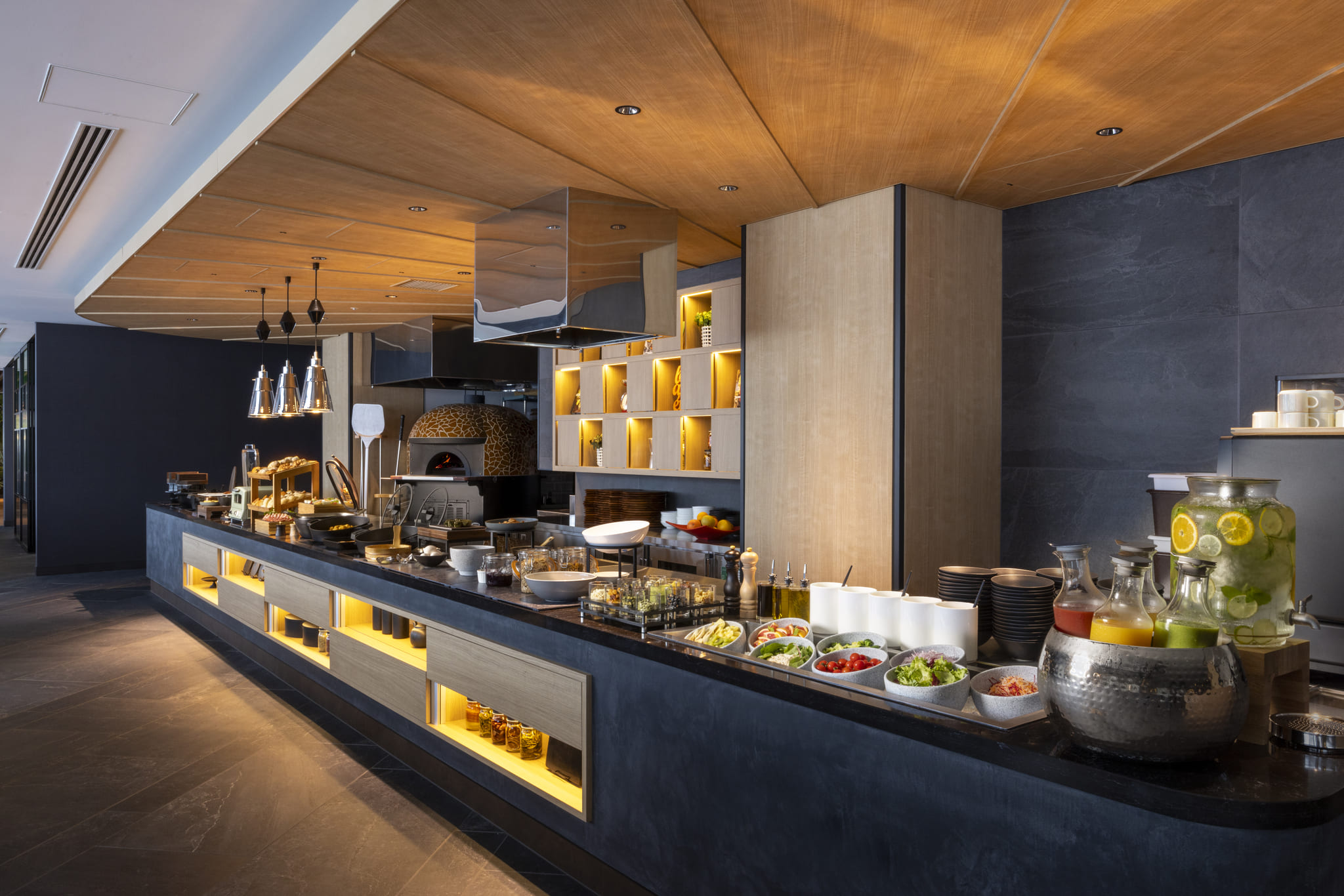 朝にうれしい温かい料理をバランスよくそろえたホットディッシュに加え、奈良ならではの“柿の葉”をほんのり香らせた自家製フレンチトーストもご用意。 さらに、県産野菜を自分好みにアレンジできる彩り豊かなトッピングコーナーなど、多彩なメニューをお楽しみいただけます。 奈良県産の朝どれサラダ、スーパーフード、ベーカリー、ヨーグルト、フルーツ、ドリンクまで幅広く揃え、奈良のやさしい朝を感じながら、心と体を満たすひとときをお過ごしください。